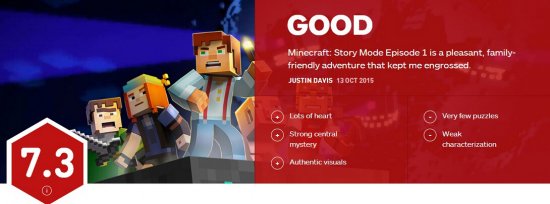 《我的世界:故事模式》有着暖心的场景、幽默的对白以及可贵的友情。让人深深的为之着迷。IGN给出7.3分。