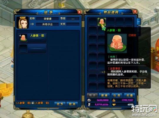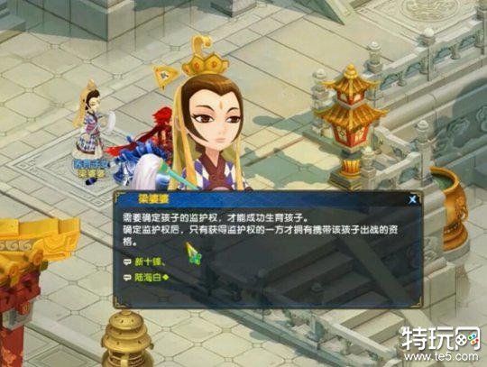 已婚夫妻玩家可以组队到粱婆婆处,选择生育子女,并收集5个阴阳人参果交给婆婆,等待7天之后便可随机领养一名子女,不过子女的监护权要分清哦,只有获得监护权的一方才拥有携带子女出战的资格,同时每个人只能拥有一名子女!