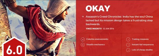《刺客信条编年史:印度》带来了一股绚丽多彩的独特风格,游戏期初承诺将会和之前的《刺客信条编年史:中国》截然不同,但 很显然,游戏似乎越走越歪,画面上来说,本作的确非常艳丽,但游戏却在其他地方跌倒,作为一款潜入游戏,薄弱的战术设定以及脆弱的任务目标都让游戏倒退了一步,游戏甚至还没有中国好玩。IGN给出了6.0分。(此前《刺客信条编年史:中国》的IGN评分为6.4)