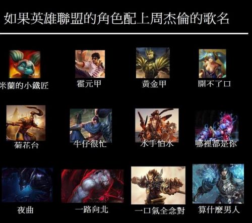 此前,周杰伦确定出任LOL明星召唤师、超越大使,并将为LOL撰写主题曲。日前,有台服网友在网络上发布了一张图片,机智的网友为诸多英雄分配了符合自己特点的周杰伦经典歌曲,例如皇子是《黄金甲》等。