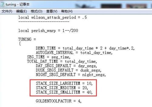 这里STACK_SIZE_LARGEITEM指的是大物品如加工过的石块、木板,STACK_SIZE_MEDITEN指的是中型物品如原木、岩石块等,STACK_SIZE_SMALLITEM指的是小物品如最基本的草、树枝。修改“=”后面对应的树枝即可修改对应类型的物品堆叠数量。