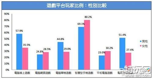 若进一步以性别观察平台玩家比例,女性前三名依序为“智能手机游戏(80.2%)、PC在线游戏(35.5%)、平板电脑游戏(30.2%)”。男性前三名则为“智能手机游戏(69.1%)、PC在线游戏(57.9%)、主机游戏(51.4%)”。整体而言,女性集中游玩手机游戏的程度较男性明显。