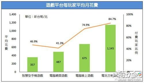 在平均月均消费额方面,根据资策会MIC调查,前四名依序为“主机游戏(新台币1145元)、PC在线游戏(新台币675元)、PC网页游戏(新台币487元)、智能手机游戏(新台币357元)”,整体而言,主机游戏月均消费超出手游将近3倍。