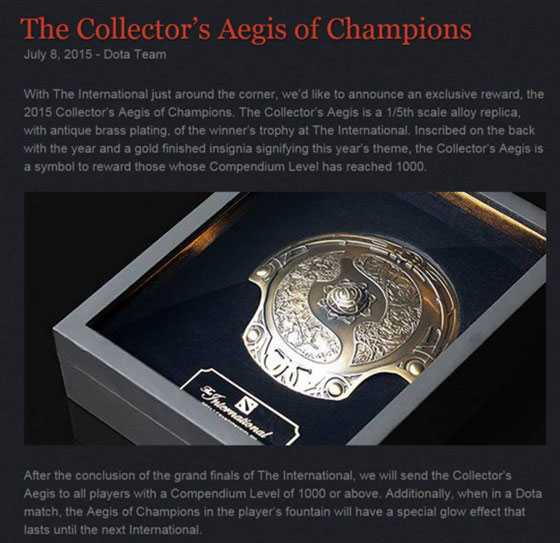 With The International just around the corner, we’d like to announce an exclusive reward, the 2015 Collector’s Aegis of Champions. The Collector’s Aegis is a 1/5th scale alloy replica, with antique brass plating, of the winner’s trophy at The International. Inscribed on the back with the year and a gold finished insignia signifying this year’s theme, the Collector’s Aegis is a symbol to reward those whose Compendium Level has reached 1000.