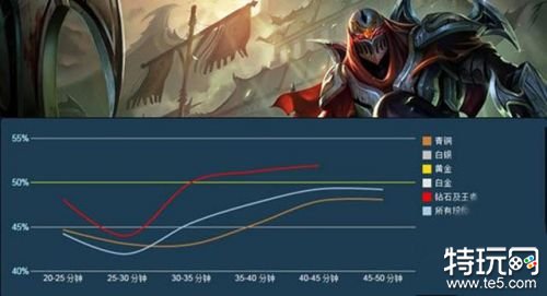 在曲线图我们可以看到,劫的胜率是呈现一个凹形的,在20-25分钟早期结束的比赛中,劫的胜率并没有很低,因为这一阶段发育良好的劫能够轻松带起节奏,依靠他的高伤害秒掉对方的后排以致于成功Carry全场。