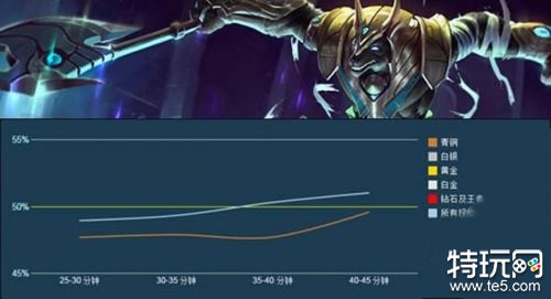 狗头因为其成长周期长成为一名典型的后期英雄,其胜率也是非常规律的随着时间的增长而提升,从曲线中我们可以看到狗头的发育周期至少需要30分钟以上,因此在搭配狗头这名英雄时需要着重姚律适合的阵容配置。