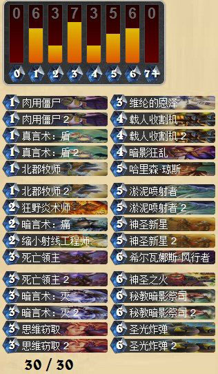 这是现阶段我觉得最好的牧师卡组。卡组构成虽然简单,但实际上操作起来非常难。要求操作者对所有主流和非主流卡组有很深的了解,以及极强的变通,而大家在意的吃排序只是其中一个很小的原因,因为没有卡组不吃排序,仔细的观察下,你会发现,这套牧师的前期曲线和T7猎人,动物园火妖法等快攻卡组相当。基本上不用担心卡手的问题。去除和AOE十足,也是我敢于放弃精神控制和后期大生物随从。