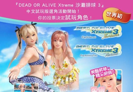 KT社近日公布《死或生》系列最新作,PlayStation 4/PlayStation Vita专用度假游戏《死或生:沙滩排球3》中文版预定2016年春季发售決定,本作除了一般版之外,预定同时发售附有豪華特典的「特典版」与「最強版」。