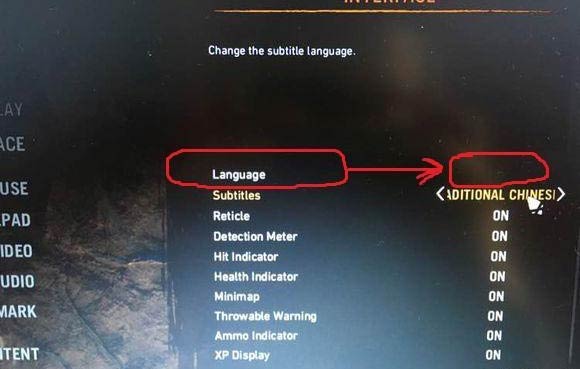 孤岛惊魂原始杀戮自带简体中文,所以玩家要知道的就是如何设置,首先就是找到设置界面进入到上图的设置画面,language就是语言选择,subtitles 是字幕的意思,分别控制语言和字母,把后面那个划红框的地方选择成chinese就可以了,这两个地方都需要更改,这样进入游戏后语言和字幕都会变成中文!