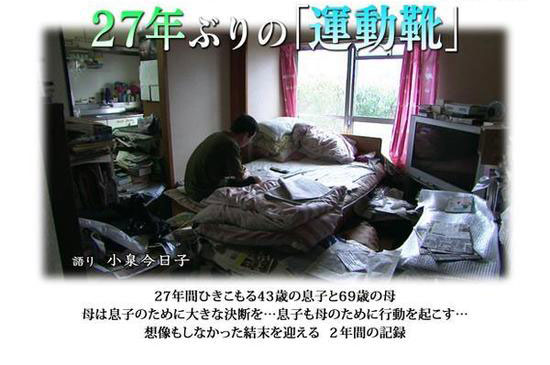 这位化名为“真树”的宅男先生,43岁,不工作,和妈妈同住的啃老族。他唯一比较厉害的是——整整27年来没出过房门。也就是说从公元1988年,从他16岁开始,就一直宅在自己房间里没动过。如今全靠69岁的老妈妈照顾一切生活起居。