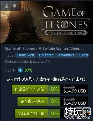 《权力的游戏》游戏现价为:14.99刀(折合人民币约93元左右)