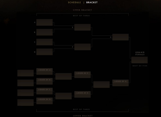 正赛对阵图,除了败者组第一轮BO1(一局决胜负) 总决赛BO5(五局三胜),剩下的比赛均为BO3(三局两胜) 。