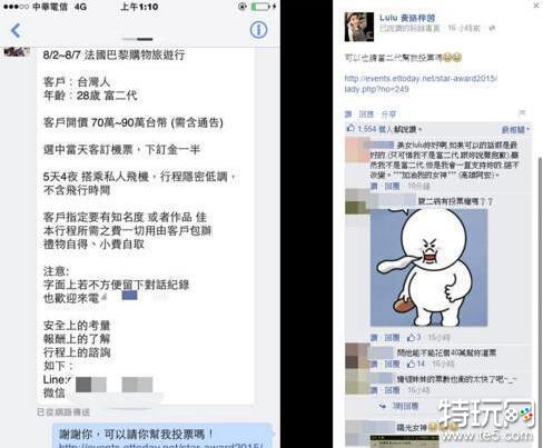 LULU今年入围台湾媒体举办的“2015星光大赏女神榜”,人气持续攀升,23日凌晨她在脸书上PO出了一段私讯对话,对方提出伴游邀请,要她5天4夜陪一名28岁的台湾富二代到巴黎玩乐,开价70至90万台币的天价酬劳,且过程中还可以收到小费及礼物。