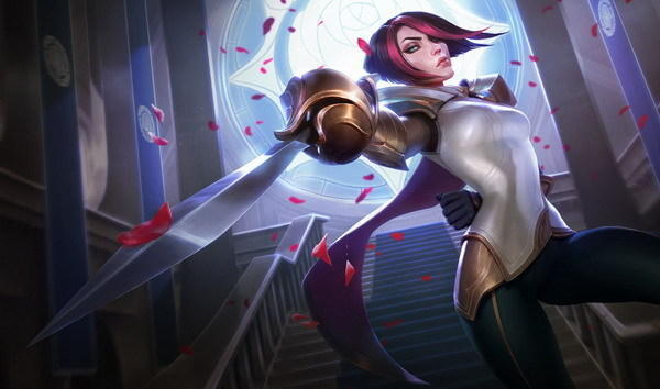 老版剑姬原画,高贵中带着傲气,双持长短剑,背后是旧版劳伦特家族的家徽。整体给人的感觉就是高冷的女战士。