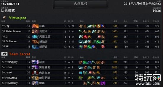 后期,秘密已经没有机会赢了,VP抓着他们干,不给露娜发育的机会,RTZ的经济依然在第5名,S4的女王虽然很早出了紫苑抓了几次VP的蓝猫,但是并没有用,唯一的作用可能就是拖慢了比赛结束的时间,可以说秘密这局是被VP打架打的不会玩了,全部的阵脚都乱了,在几次团战之后,只能无奈打出GG,恭喜VP,再见秘密。