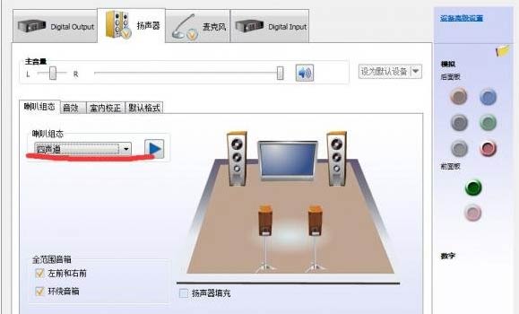首先我们检查一下是不是设置上的问题,点击电脑上的扬声器→喇叭组态→把立体声换成四声道即可。