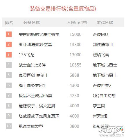 一周交易榜:奇迹MU神石售15000 魔兽涨1名