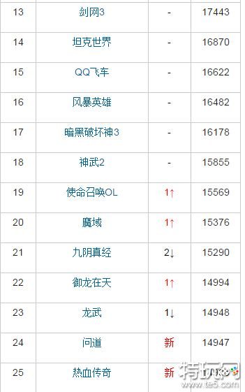 本周热门网游榜上,《问道》和《热血传奇》两款经典人气网游重新回到热游榜TOP25。而此前排在前五的《天涯明月刀》热度有所下滑,跌至第七;刚刚宣布了资料片《军团再临》的WOW本周热度也上升了一位超过天刀。