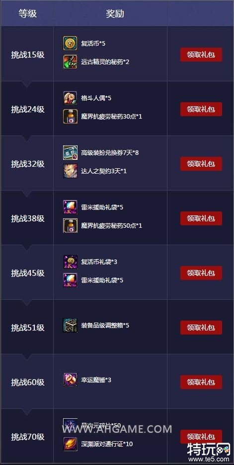 2. 活动期间,在DNF游戏内建立新角色且在活动页面绑定该角色,在游戏内达到对应等级,即可在活动页面领取对应礼包,每QQ每礼包限领一次;