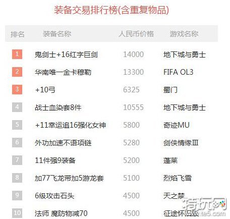 装备交易排行榜: