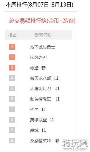 本周总交易排行:本周内容有了很大的变化,新上位的《赤壁》 通过三国的全新历史,和丰富多样的玩法,直接冲进排行榜前三名,而因为新游戏势头强劲,《新天龙八部》《天涯明月刀》等游戏依次下滑一名,唯一这周上升一位的是《魔域》凭借以幻兽、PK为核心不仅逃脱下滑的命运还稳重上升,相对这周新上榜的《反恐精英OL 》位列第10,虽没有《赤壁》这头黑马这么凶猛,但让我们一起期待下吧!