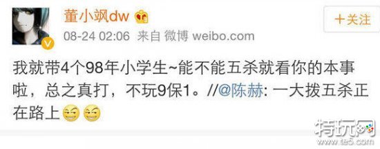 者无心听者有意,陈赫在专访中谈及游戏天赋的自信,让人气主播“董导”董小飒燃起了挑战欲望,在微博中说到:“我就带4个小学生,能不能五杀就看你的本事啦,总之真打,不玩9保1。”