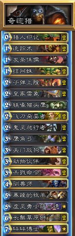 子弹上膛这张新卡在实装之前颇受争议,有些人认为太厉害,有些人则质疑以它为核心的卡组强度,算是冠军试炼版本最热门的单卡之一了。于是我迫不期待的构筑出了这套中速上膛猎,或许还有其他构筑方式,比如带上机械雪人等各种零件牌的纯上膛猎,这里暂时不讨论。单纯想象来看,可能纯上膛猎的强度确实不达标,节奏比较混乱,与猎人这个职业本身不太吻合。个人比较推崇的是下面这种以中速猎为框架的构筑方式。