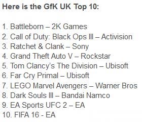 据悉,《为战而生》的销量只领先《使命召唤:黑色行动3》多100份左右,但由于这份榜单上并没有具体的数据,因此并不能够确定。值得一提的是,近期英国游戏销量下滑严重,或许是因为新游戏太多许多导致玩家还没来得及购买。