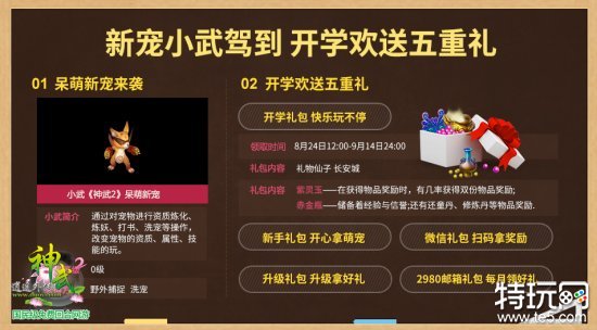 《神武2》开学季怎么能够少了好礼?所以我们的呆萌新宠“小武”带着大大的大礼包来了,五重礼包就是要让你在开学季乐不停,准备好加入《神武2》大学,就赶快进入吧!