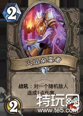 火焰杂耍者 223身材,战吼:随机打1 看上去中规中矩的一张牌,但是考虑到现在主流的1费随 从都是121身材,打中的话直接打死。而两费随从又多是223身材,如果上场打到一下,下个回合就可以白吃掉。可以说这张卡虽然效果看上去不华丽,但是实 用性绝对是非常高的,说他是白卡两费中的佼佼者也不为过。但是,整体来说两费随从基本都是一个过渡的作用,优先级并不会太高。优先级预测,中立白卡两费随 从中仅此于机械跃迁者,对于一些机械适性不好的职业或者机械不多的情况,能够在两费随从中排到首位。