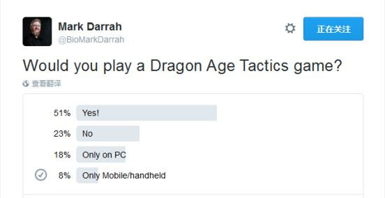 然而投票结果当然是收获了很多的“Yes!”。超过半数的粉丝表示喜欢策略类的《龙腾世纪》新作,并且只有8%的玩家希望玩到移动端版本的新作,看来大家还是希望在PC和主机上玩这部作品。另外有玩家问道游戏是否会加入一些像火纹那样的浪漫情节时,Darrah只表示或许会。我们将对这个“策略龙腾”的计划跟踪报道,敬请期待。