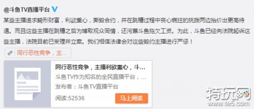 最近某同行为了上位,恶意用畸形待遇并承诺解决违约官司,诱导斗鱼某些主播毁约跳槽。斗鱼对这些主播本来就待遇不菲,年薪在几十万到数百万不等,每月还有高额的礼物分成。但这些主播为追求畸形财富,利欲熏心,撕毁合约,并在跳槽过程中丧心病狂的挑拨两边抬价出更高待遇。而且这些主播在跳槽之后为博取观众同情,还污蔑斗鱼拖欠工资。