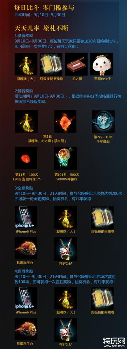 燃情金秋,战火燃起,《大话西游2免费版》召唤兽比斗争霸赛正式打响,开启一场只属于召唤兽的角逐,一次关于召唤兽的赛事!9月10日至9月30日期间,活动期间天天几率,壕礼不断!只要参加召唤兽比斗,达成指定条件即可获得参赛奖励、排行奖励、全勤奖励、百胜奖励,iPhone6 Plus、凝魂珠(大)、龙之骨、龙之魄、终极技能书残卷、珍藏年手办等丰厚奖励等你来赢!