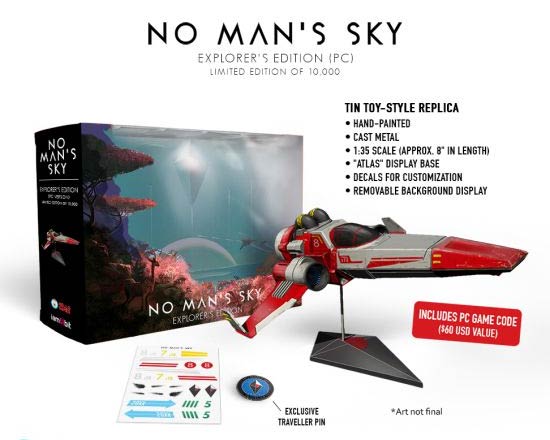 PC平台将独占一款探索者版本,限量发行1万套,附飞船模型,手绘打造,铸造金属材质,还包括一批飞机贴纸,售价150美元,游戏采用数位下载版。此外,《无人深空》也已经在Steam平台上架,国区售价158元,价格比较实惠,喜欢本作的玩家推荐入手。