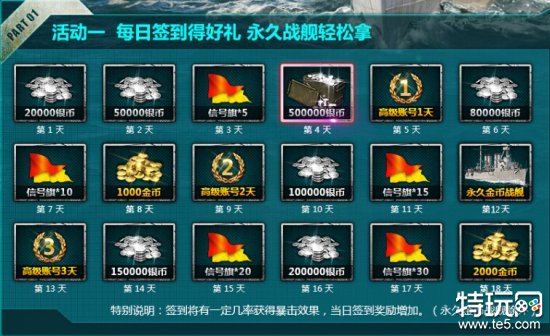 3、签到满4天、8天、12天、16天均可获得大量奖励,12天将随机获得永久金币战舰一艘!