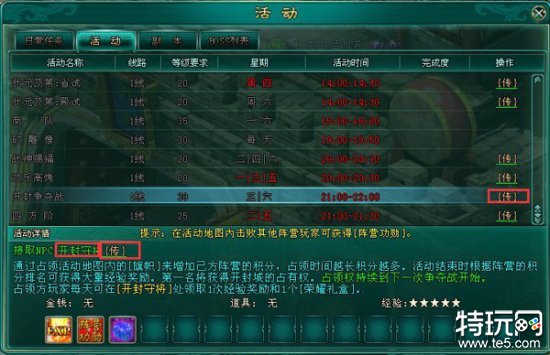 游戏中,玩家除了野外自由PK,还能于每周三、周六晚9:00-10:00大玩开封府争夺战。三大阵营内所有40级以上的玩家均可参与,哪方阵营能通过武力和策略,从两方敌对阵营的不懈攻击中,占领最多的旗帜,获取最高的阵营积分,就能成为最终的赢家!胜利的阵营方将拥有占领开封府一周的权利,可以免费领取一个特殊礼盒,奖励之丰厚足以让无数玩家为之疯狂哦!