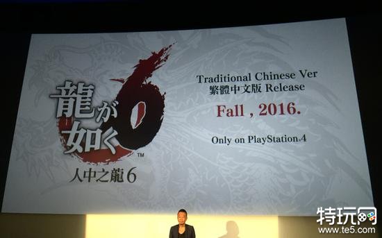 接下来明越身后的大屏幕上出现了《如龙6》的信息:《如龙6》繁体中文版将于2016年秋季与日文版同步发售!