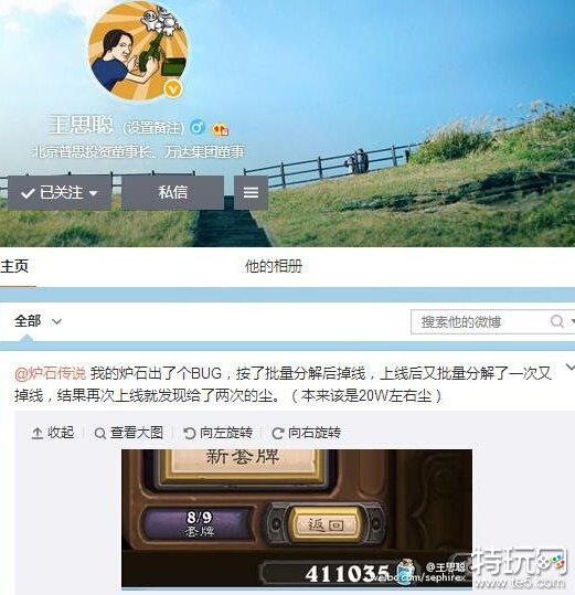 王思聪微博爆料《炉石传说》出现刷尘BUG