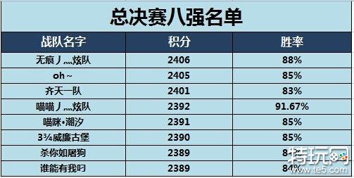 积分赛期间,由于实力战队数量较多,积分榜单几乎每过一个比赛日都经历一次大换血,在这种剑拔弩张的局势下,最终勇闯总决赛的八支队伍是:无痕炫队战队、oh~战队、齐天一队战队、喵喵炫队战队、喵咪·潮汐战队、威廉古堡战队、杀你如屠狗战队、谁能有我叼战队。其中有一直保持前10的队伍,也有最后五天从80名开外挤进前8的队伍,目前夺冠呼声最高的无疑是预选赛积分第一的无痕战队和发挥一直很稳定的威廉古堡战队,但另外六支战队也不容小觑,不到最后一刻都无法定论,可以确定的是八支战队将会给我们带来一场前所未有的高水平竞技赛事!