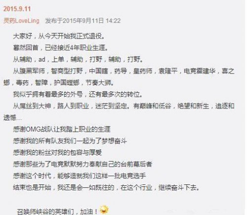 2015年9月11日,OMG三位队员:gogoing,灵药和诺夏宣布退役。然而这场看似平淡的退役却总是少了点什么,OMG的战队官方微博也没有任何表示,这几位队员和战队之间究竟发生了什么事情?真的是恩断义绝?