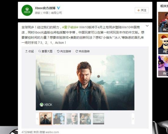 今天,Xbox官方微博公布了一个让人惊喜的消息,Win10版本的《量子破碎》将于4月上旬全球同步登陆Win10中国商店。