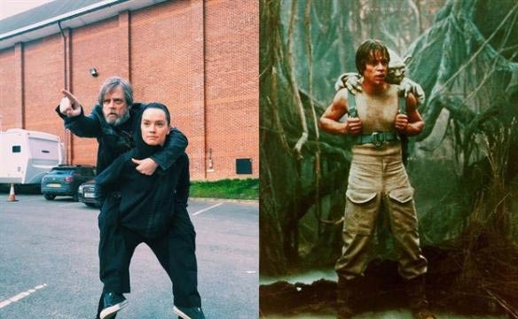 《星球大战8》正在英国松木片场热拍,4月10日恰逢女主角黛茜·雷德利24岁生日,该片男主角卢克扮演者马克·哈米尔在推特发布两人合影以表祝福,有趣的是,照片中黛茜背着哈米尔刚好还原的是《星球大战2:帝国反击战》中尤达训练卢克的经典场景,看来绝地武士都是这样训练出来的。