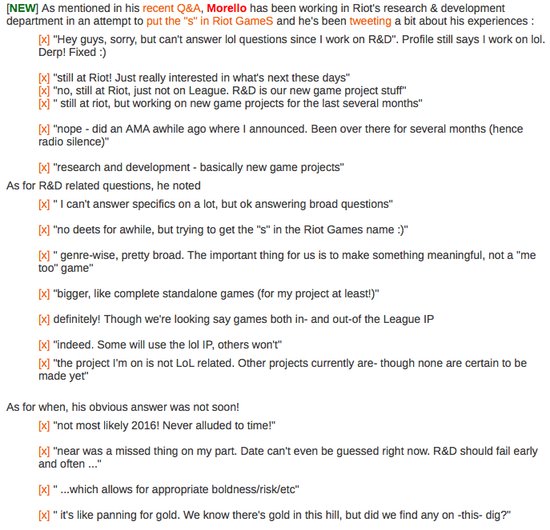 昵称为“Riot Morello”的Ryan Scott于上周在推特上发布声明称,其未来不再会回答任何有关于《英雄联盟》的问题,因为他已经转移到Riot公司正在着手开发的另外一款游戏的项目中。