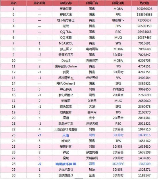 《天涯明月刀》下降两位,跌出前6名;《魔兽世界》《炉石传说》上升。