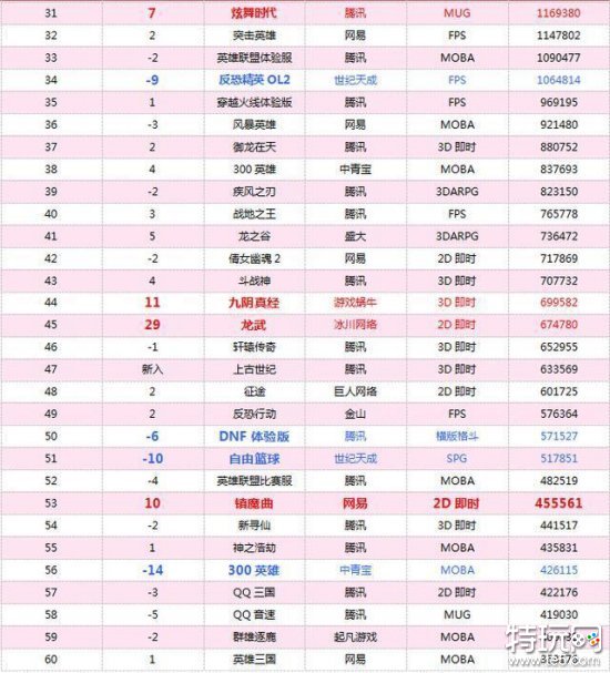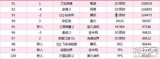 《英雄联盟》《穿越火线》《地下城与勇士》依旧分别保持前三的好名次。《梦三国》上升一位,位列第八《Dota2》,维持上周成绩继续位列第10;《天谕》、《暗黑破坏神III》、《大唐无双零》均有下滑,《上古世纪》新入榜单,表现也十分不错,排位前50。