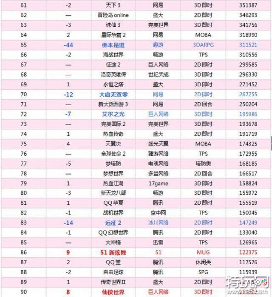 本期看点:《佛本是道》上月势头迅猛,连升20位,但这月猛跌44名;《天涯明月刀》下降两位,跌出前6名;《魔兽世界》《炉石传说》上升。