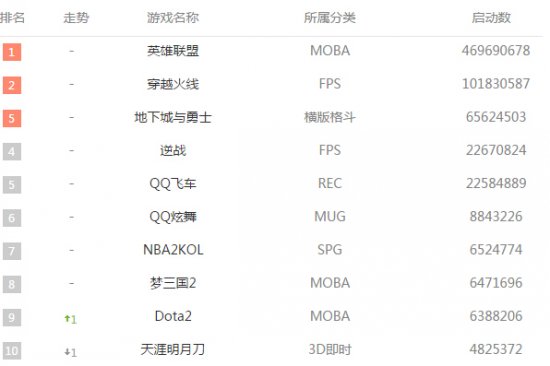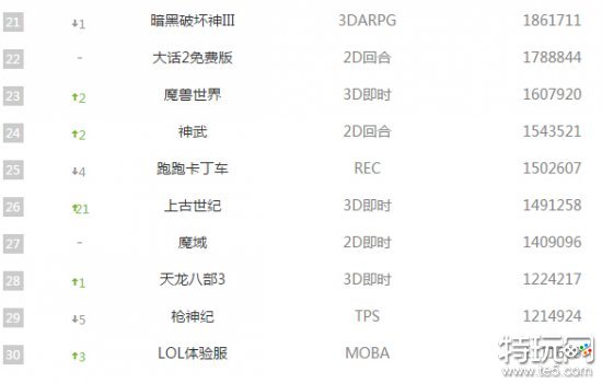 腾讯《英雄联盟》连霸榜首数月,依次排位到第九位没有任何变化。《DOTA2》上升一位将上周排位第九的《天涯明月刀》挤到第十位的排名。暴雪《炉石传说》网易《梦幻西游》都上升一位《FIFA Online 3》连降3名、《桃花源记》、《斗仙》新入榜单,表现也十分不错,《暗黑破坏神III》上周排位不理想,这周凶猛连升7位,同时《魔兽世界》玩家回流也在稳定上升,排位第23名。