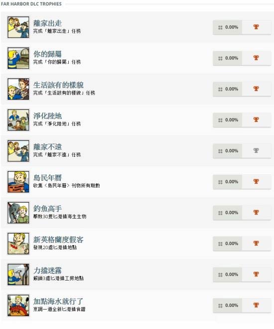 《辐射4》新DLC“港湾惊魂”将于本月19日正式上线,而今日Exophase曝光了这款DLC的全部PS4奖杯,从中我们似乎能窥见到一些游戏的信息。