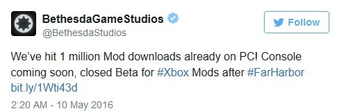 《辐射4(Fallout 4)》的官方mod系统在PC平台上线将近两周后,Bethesda确认将在下周开始Xbox One版mod的封测,测试的具体时间是本作第三个DLC“港湾惊魂”上线之后(2016年5月19日)。
