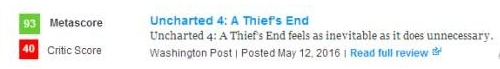 《神秘海域4:盗贼末路(Uncharted 4: A Thief’s End)》发售后,凭借出色的画面和精彩的战斗博得世界玩家的一致好评,综合类评分网站Metacritic上平均分更是高达94分,但是这时候,华盛顿邮报冒出来给予了游戏40分的评价,满分100分。